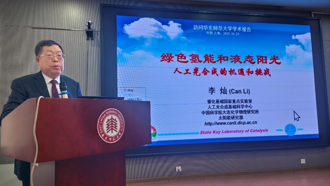 2025年10月23日上午10点,中国科学院院士、中科院大连化学物理研究所李灿研究员受上海市绿色化学与化工过程绿色化重点实验室名誉主任何鸣元院士的邀请,在华东师范大学普陀校区化学馆A205会议室为体育博彩平台 、绿色化学重点实验室的师生们带来了一场“大师讲堂系列学术报告”。本次学术报告,李灿院士围绕“绿色氢能和液态阳光甲醇:人工光合成的机遇与挑战”展开,主要介绍了他们研究团队在人工光合成这一领域的最新进展,特别是在以绿色氢能和液态阳光甲醇为代表的人工光合成研究中遇到的机遇与挑战。