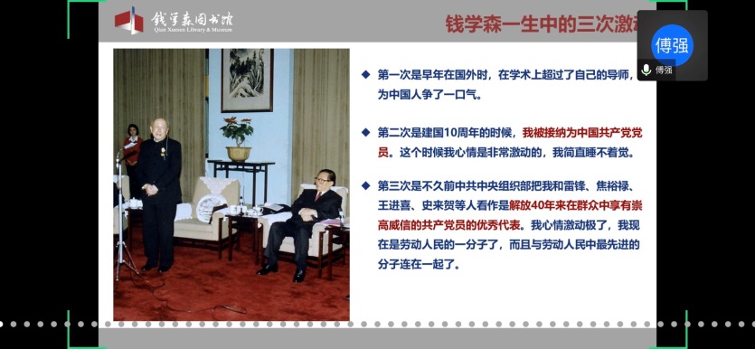 首先,童老师欢迎并介绍了本次党校培训班的主讲嘉宾傅强老师。傅老师是上海交通大学钱学森图书馆社教宣传部部长、副研究馆员,也是中国浦东干部学院课外教学点教员、上海市委宣传部东方讲坛特约讲师、资深博物馆教育工作者。本次党校培训班的内容包括两个板块,第一版块是依托钱学森图书馆(以下简称钱馆)“虚拟漫游馆”,由傅强老师带领学员们“云导览”;第二版块是题为“优秀共产党员——人民科学家钱学森”的主题报告。